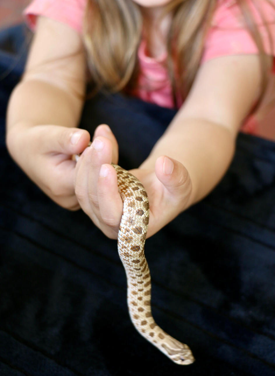 Hognose snakes tend to become calmer with regular gentle handling. We handle all of our reptiles regularly. Support their body fully and avoid grabbing their head. Be prepared for their dramatic defensive displays.